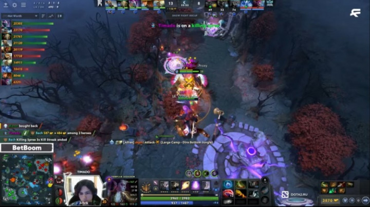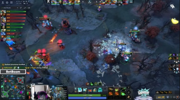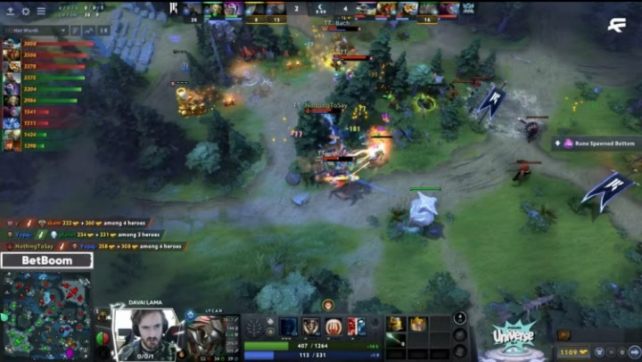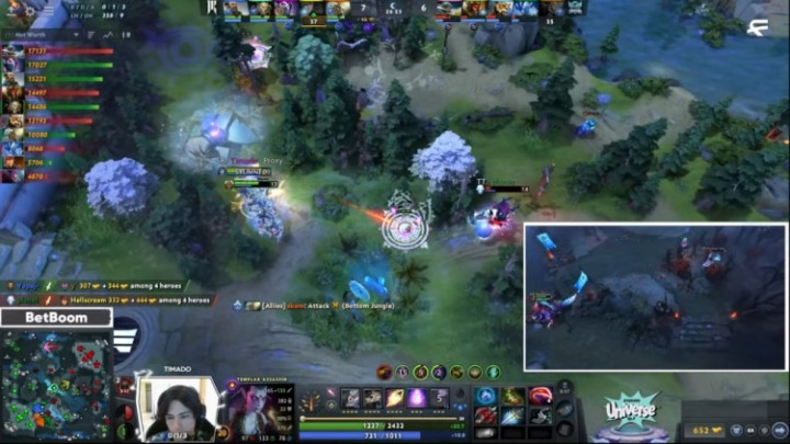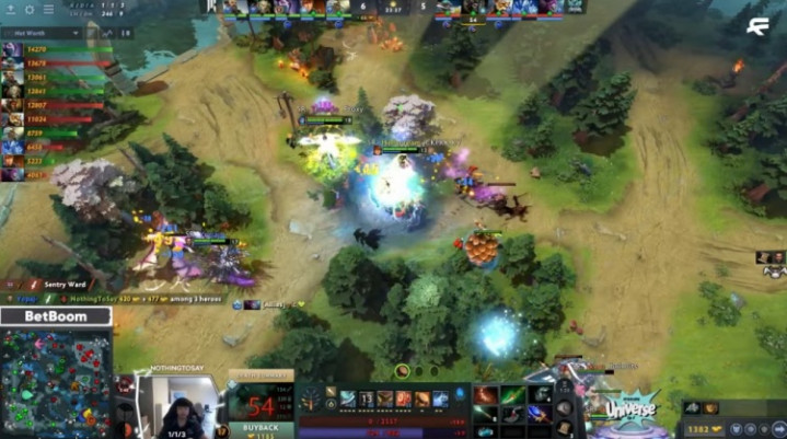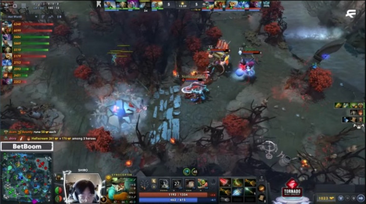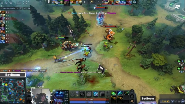 [6:20]skem与Hellscream两人走到TBD中路树林中找到planet将其击杀,随后SR双酱油合体再野区找人开团,y戴泽双杀,TBD打出1换3,推掉SR下路一塔,经济领先3k。