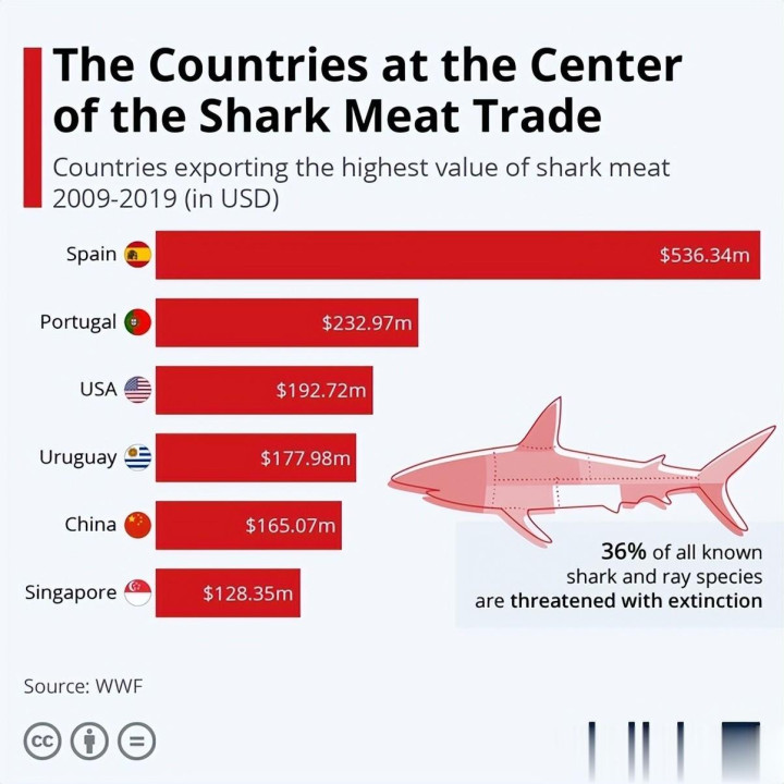 “利用鲨鱼的每一个部分”正是这里的问题,也是为什么尽管中国对鱼翅进行了监管,但世界各地的鲨鱼数量仍在持续下降。近年来,全球对鲨鱼肉的需求实际上急剧上升,意大利、德国和西班牙等欧洲国家是其主要进口国。
